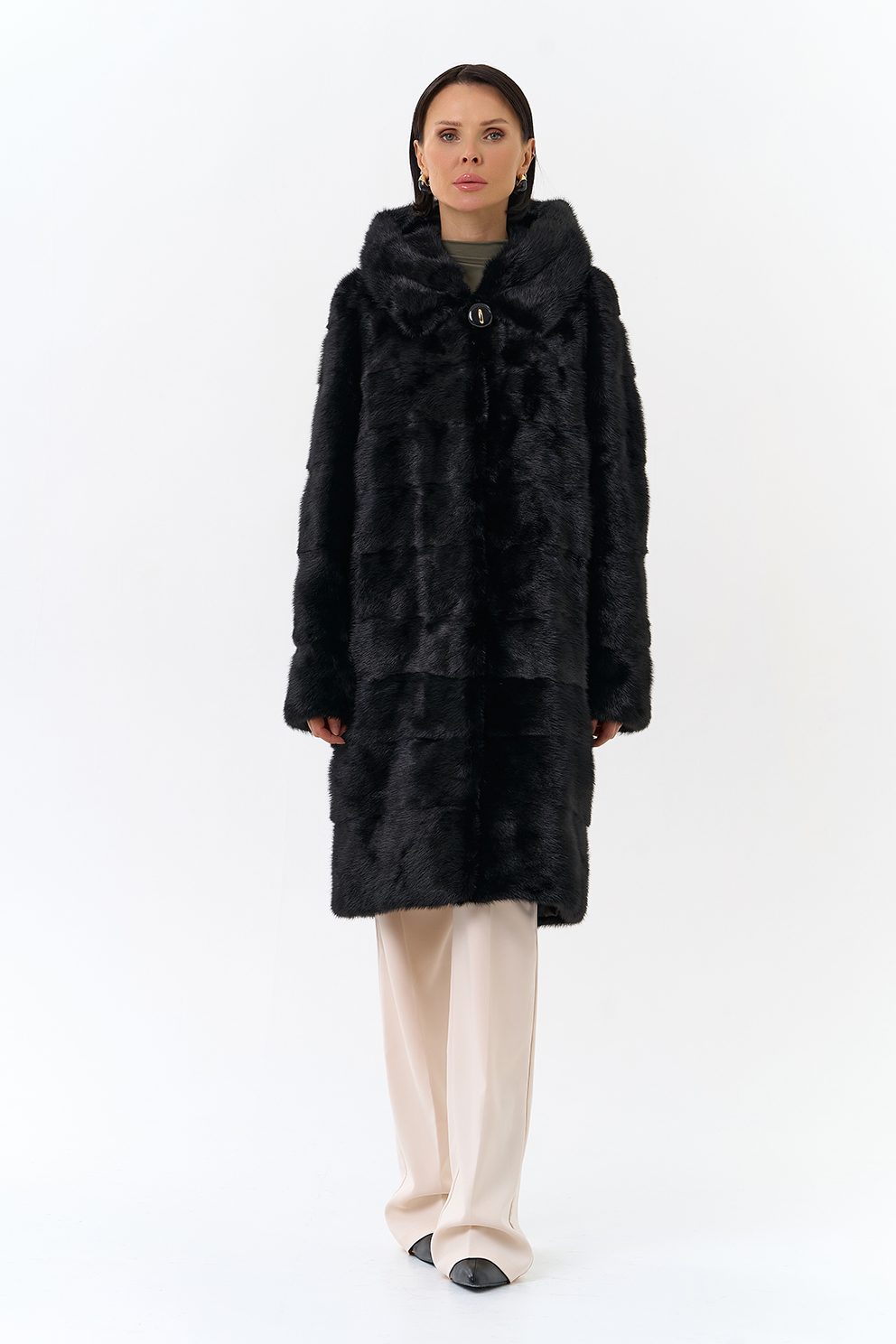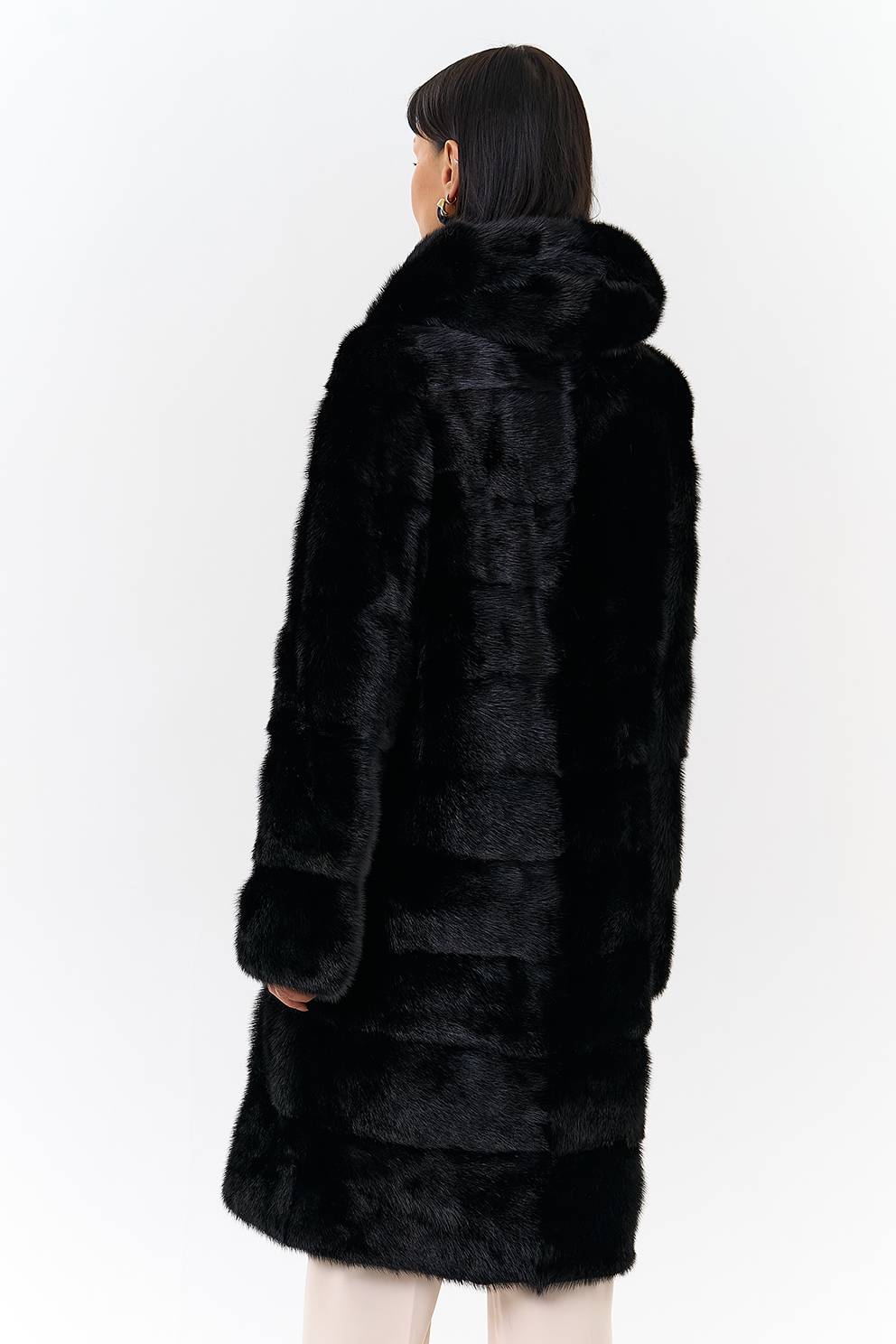 Шуба из меха норки черного цвета. Изделие средней длины, но его можно укоротить, как и рукава. Застегивается с помощью шубных крючков и пуговицы. Модель прямого фасона и дополнена объемным капюшоном. Раскладка меха - поперечные пластины. Подклад из полиэстера износоустойчив и позволяет носить шубу долгое время. Модель сочетается как с брюками, так и с юбками.